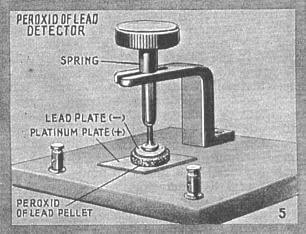 The铅的过氧化物detector devised by S. G. Brown of England is illustrated at Fig. 5. This detector has proven quite successful and is used with a pair of sensitive telephone receivers and a critically adjusted battery current. The instrument comprises a peroxid of lead pellet mounted between an upperleaddisk and a lowerplatinumone; the pressure on the peroxid of lead pellet being adjustable by means of a thumb screw and spring in the usual fashion. This detector has been termed, more or less correctly, thedryelectrolytic detector and its action is supposed to depend upon the fact that an incoming oscillation intensifies the counter-electromotive force set up by the cell (electro-chemical action due to lead-peroxid lead-platinum couple) and which opposes the applied battery current (1.5 volts about), thus causing the detector to increase its effective resistance. This results in a drop of current in the ‘phone circuit; as soon as the oscillation ceases the ‘phone current increases.