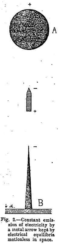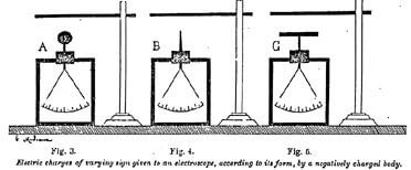 (图2)是影响带电体。它却指控阳电在任何意味着我们请(1)。下面我们看到一块铝或金箔半厘米宽,两厘米高。B是一个金属杆放在一个表或拿在手里。几个试验的位置很容易发现的金属仍然是完全和无限静止在空间。尽管轻微的一致性仍持有的固定和刚性好像泉水,及其指出抛出小火花在黑暗中可见。其各个部分指控,图中所示的方向。