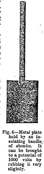 容易影响以下实验条各种金属——铜、铝、等,一个矩形的形式大约10厘米平方,必须牢牢地固定在硬橡胶处理。如果用一只手握住硬橡胶处理,金属条稍微擦用猫皮举行,这将是看到的,将金属接近验电器,它有电的一个潜在的从1000年到1500伏特。金叶子有时水平突出,甚至可能会撕裂。